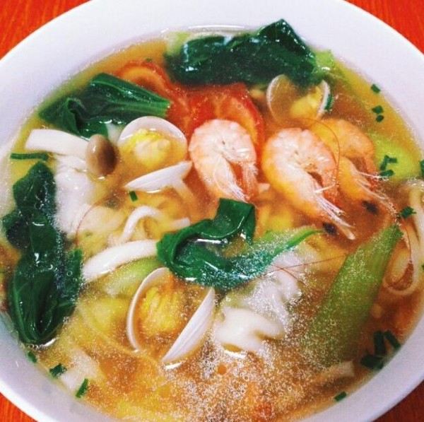 待水餃和面條差不多快熟的時候,放入菜葉,焯過的蝦、蛤蜊和番茄。記住菜葉要整片的,不然一燙就沒了。等待一分鐘拿來大面碗起鍋吧。怎么樣,色香味俱全誘人吧,趕緊行動吧。